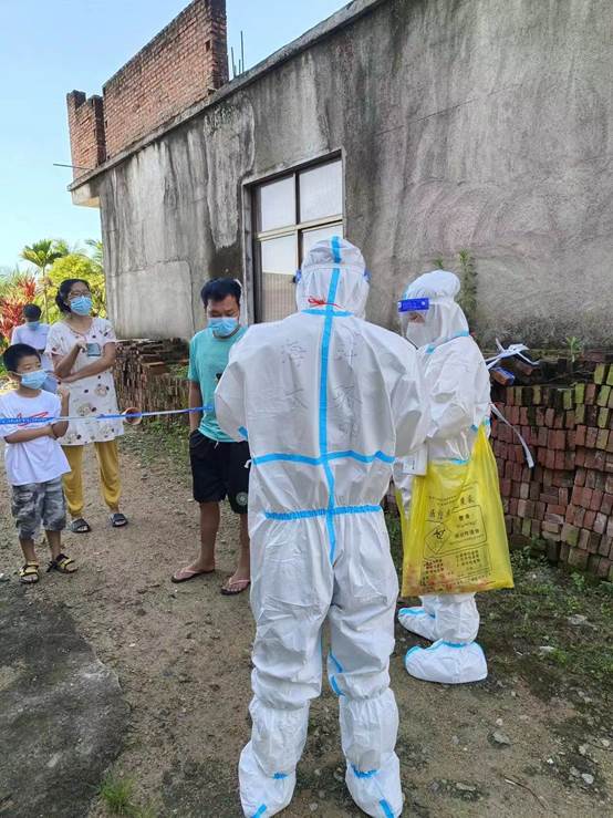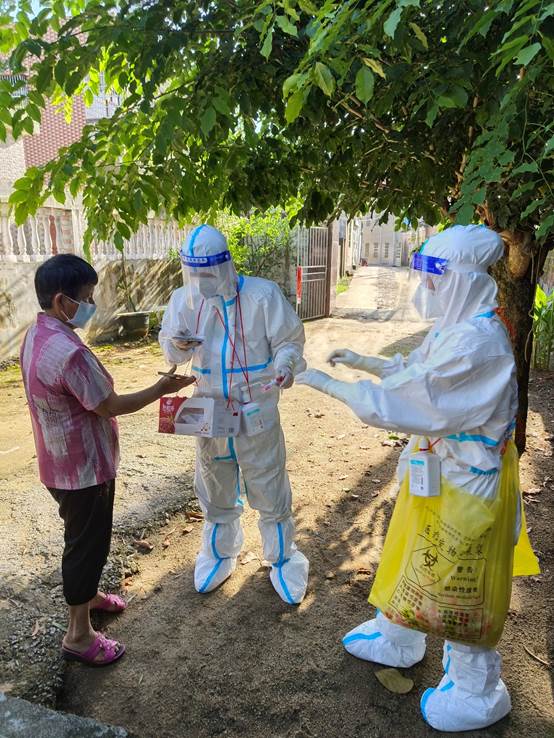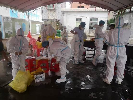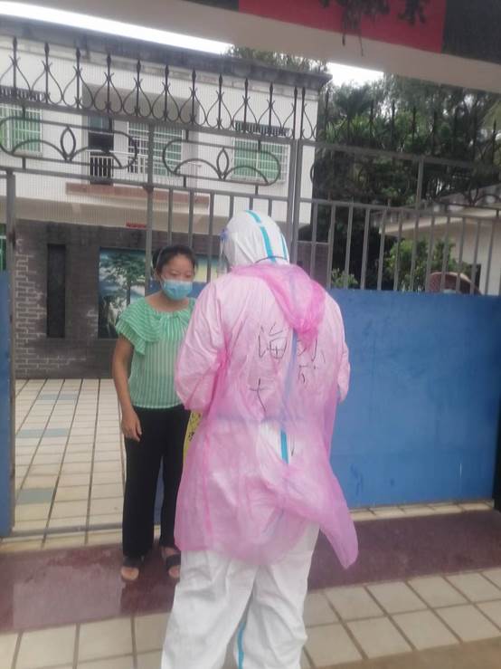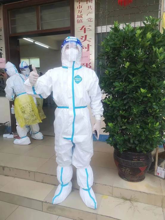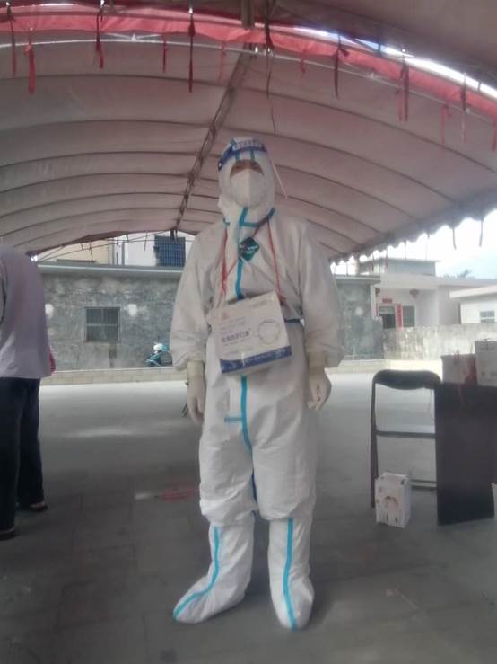 许环明克服困难,到达车头村委会马上开展工作,进行核酸采集信息录入支援任务。车头村处于高风险地区,有一千多名居民。每天执行任务都必须穿防护服装与医护人员进行挨门挨户的给村民做核酸采集,穿上防护服在高温的炙烤下非常的闷热,不到一会已经全身湿透了。许环明经常开玩笑说,穿防护服还能享受到免费的桑拿,以乐观的心态抗击疫情。