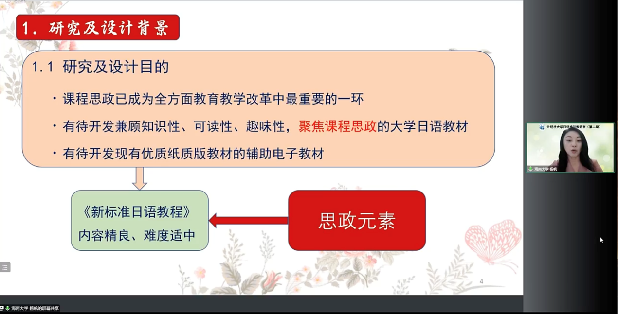 此次讲座中,杨帆教授从课程思政角度结合《新标准日语教程》讲解了大学日语数字化教学,以及如何在课堂中融入思政元素。讲座内容包括研究及设计背景、研究思路及内容、实例介绍、讨论环节四大板块。