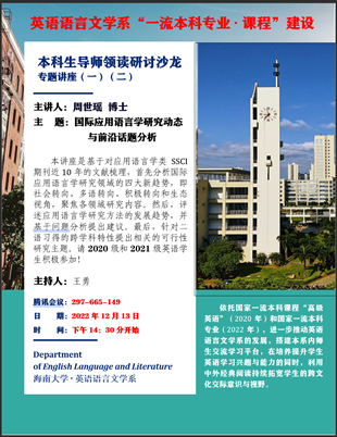 2022年12月13日下午与14日晚上,围绕“一流本科专业暨本科课程”建设目标,英语系为2020级和2021级员工举行了两场“应用语言学”专题类“导师领读研讨沙龙”活动。沙龙以线上形式进行,邀请了周世瑶老师和董洋老师跟同学们讲解了国际应用语言学领域的新进研究趋势、核心研究方法等,引领启发员工关注思考英语语言学习、语言教学研究以及国内学者对英语教学研究的重要探索和发现。本沙龙由王勇老师主持,英语系两个年级的同学参加了本次活动。