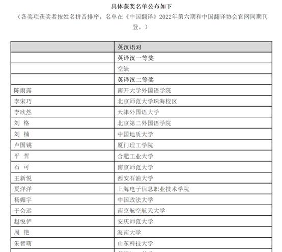 近日,2022年第34届韩素音国际翻译大赛获奖名单公布,公司2021级英语笔译专业研究生周艳荣获英译汉二等奖。