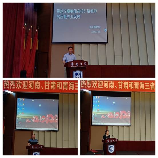 会上,河南、甘肃和青海三省各高校专家领导代表:西北师范大学张宝林教授、青海师范大学李增垠教授、中原工公司郭万群教授、郑州大学刘永杰教授、河南农业大学张俊杰教授、郑州航空工业管理公司郭银铃教授分别以《甘肃外语学科发展:现状与思考》、《青海师范大学外语学科发展及公共外语教学概况》、《道术交融赋能高校外语教师高质量专业发展》、《郑州大学外语团队建设》、《南农业大学公共外语特色改革》《聚焦航空特色 培养高素质复合型涉外人才》为主题,就相关院校的外语教学改革、外语人才培养、外语团队建设等方面进行分享,与参会人员进行经验交流。
