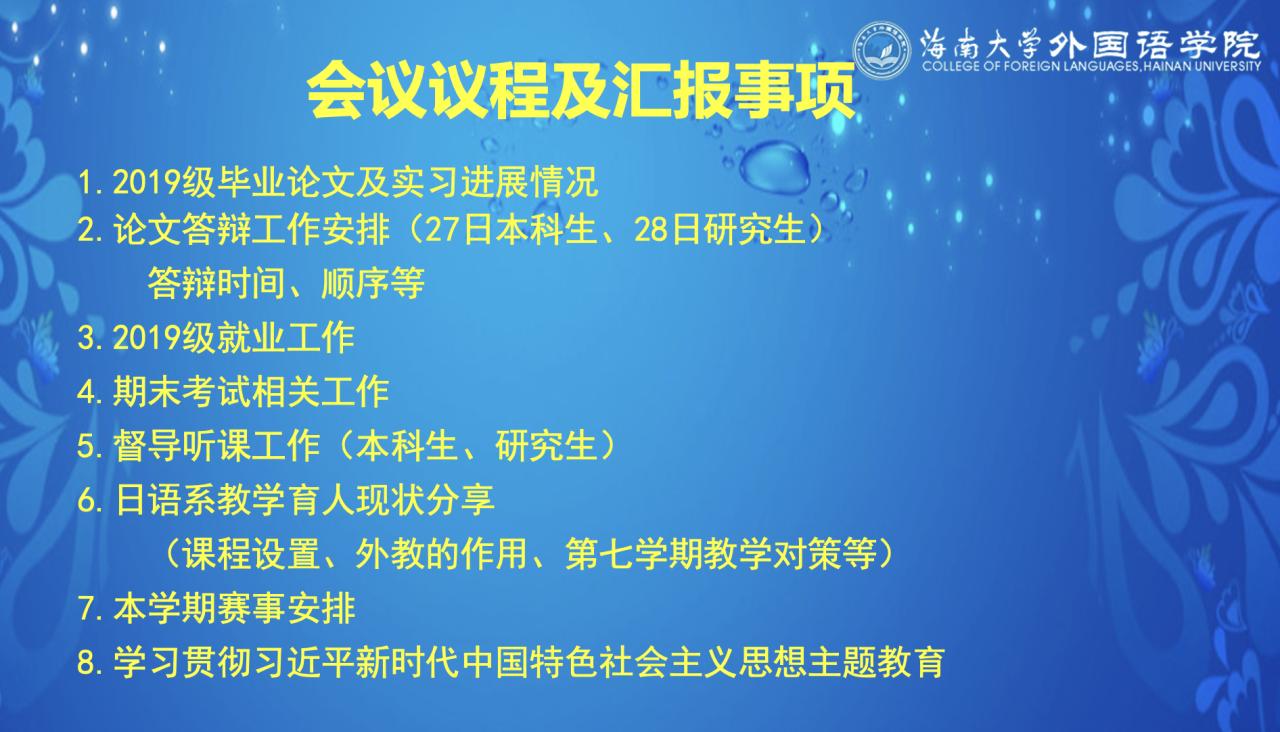 首先,日语系全体老师各自汇报了毕业论文的修改及交叉评阅进度,