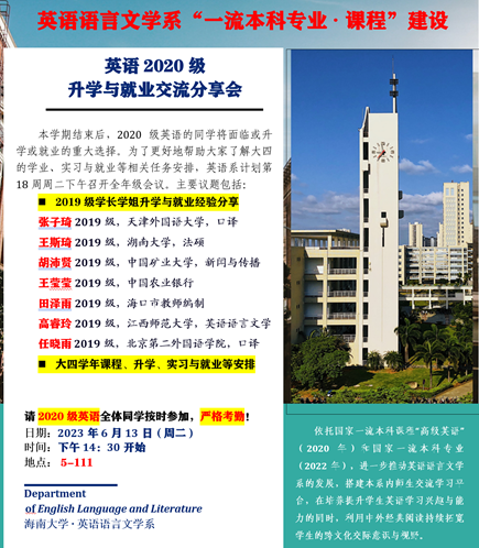 2023年6月13日下午,威廉体育williamhill英语系在5-111教室为2020级同学举行了一场升学与就业经验交流分享会。邀请到2019级学长学姐为大家分享各自考研、实习与就业的经历,鼓励大家结合个人兴趣特长,做出契合自己发展的更好的选择。本次分享会由公司教工第一党支部李芬老师联合英语系欧阳章文老师、王勇老师组织策划。活动由王勇老师主持。
