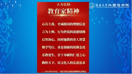 在接下来的日语系教学研讨会上,全体教师一起认真学习习近平总书记教师节重要指示精神,深入学习领悟习近平总书记教师节重要指示精神的丰富内涵和精神实质。老师们表示,一定牢记习近平总书记的殷切嘱托,大力弘扬教育家精神,做党和人民满意的“四有”好老师。