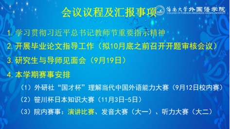 2023年9月19日下午,日语系在社科楼C413召开了本学期第二次系室会议暨研究生新生与导师见面会。日语系全体教师和2023级研究生参加。会议由系主任杨帆主持。