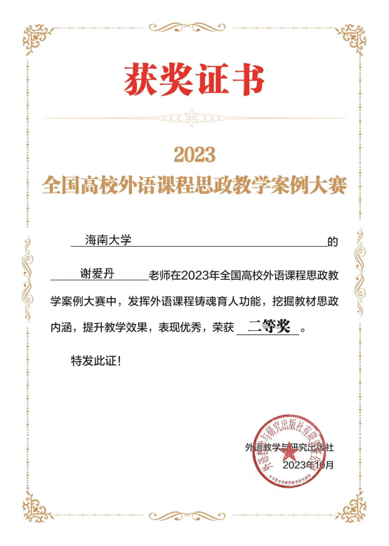 全国高校外语课程思政教学案例大赛由外语教学与研究出版社主办,旨通过搭建沟通交流课程思政育人实践的赛事平台,全面提升课程思政建设深入性、创新性与有效性,助力高校服务国家战略、培养新时代所需的高素质外语人才。