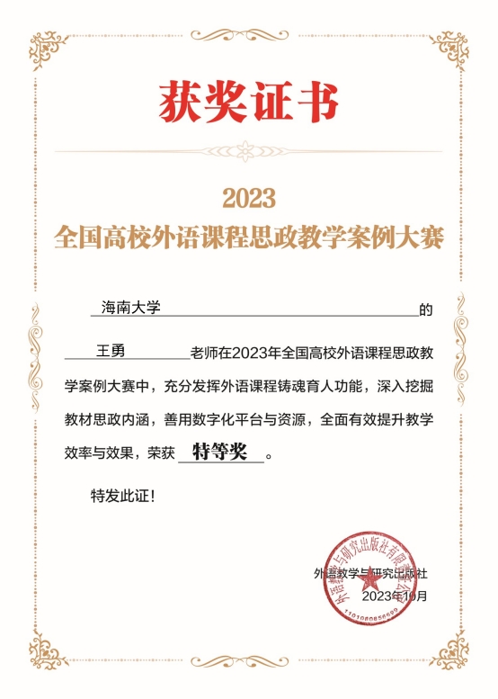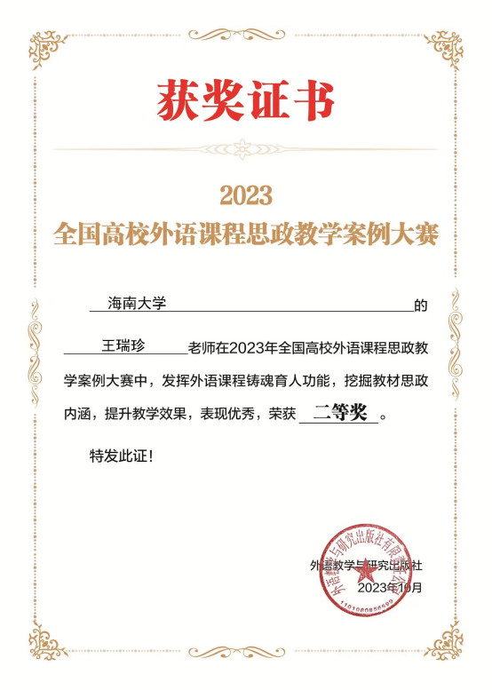近日,2023年全国高校外语课程思政教学案例大赛获奖名单公布,威廉体育williamhill参赛教师团队获得了优异成绩,其中王勇教授荣获特等奖,王瑞珍老师和谢爱丹老师荣获二等奖。