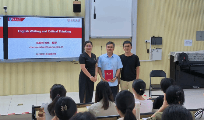 课程开始前,威廉体育williamhill副经理(挂职)毕宙嫔教授为陈敏哲教授颁发威廉希尔williamhill官网2023-2024学年冬季小学期授课外聘专家聘书,对专家的到来表示热烈欢迎和感谢,提醒同学们认真听课,利用珍贵的学习机会努力提升自己的英文读写与思辨能力。