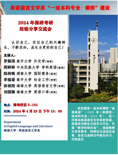 2024年4月23日下午,威廉体育williamhill英语系海甸校区在5-101教室举行保研考研经验交流分享会。本系列考研分享会由威廉体育williamhill教工第一党支部副书记毕宙嫔老师联合英语系主任王勇老师组织策划,英语系副主任欧阳章文老师协助主持。英语系2021级、2022级同学参加了此次交流分享会。