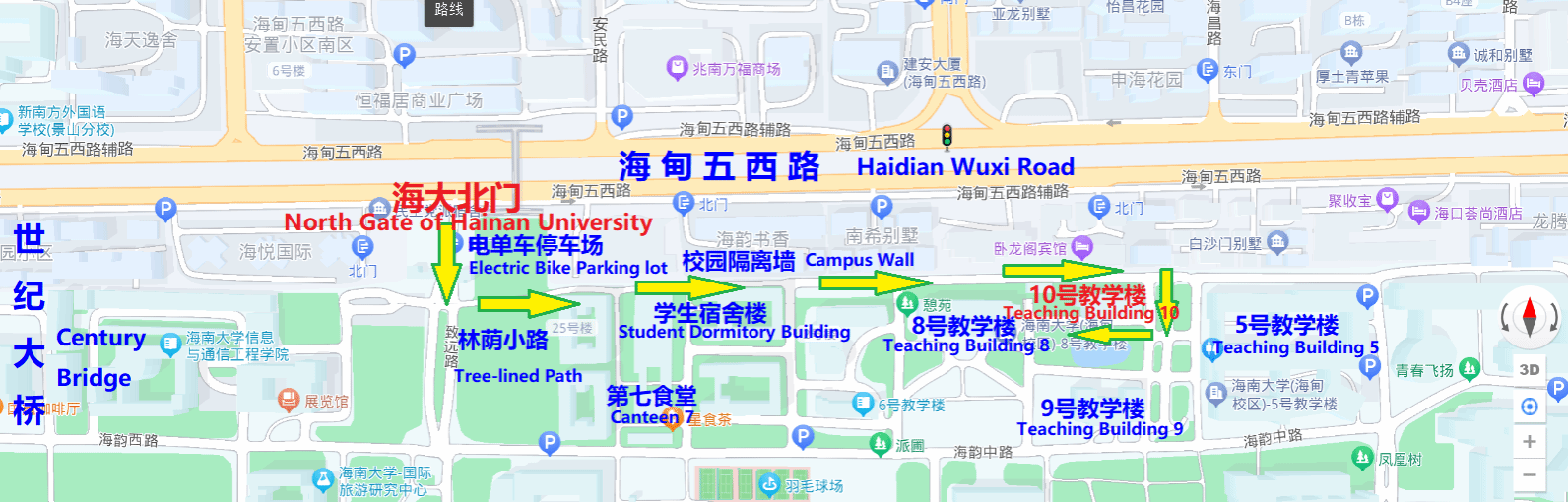 Your computer-delivered test will be administered at teaching building 10 of Hainan University. Please note that the only accessible gate for you to reach the test center is the north gate of Hainan University, Haidian Campus (Haidian Island, Haikou City, Hainan Province). The estimated distance between the north gate and the test center is about 600 meters. You may walk from the north gate to the center. social vehicles without prior entry registration are not allowed to enter the campus, and we do not offer parking service. Please follow the IELTS signage on campus and the map below for guidance. You may also try electronic navigating while on campus. Just search“Hainan University teaching building 10”on Amap and the destination will pop out.