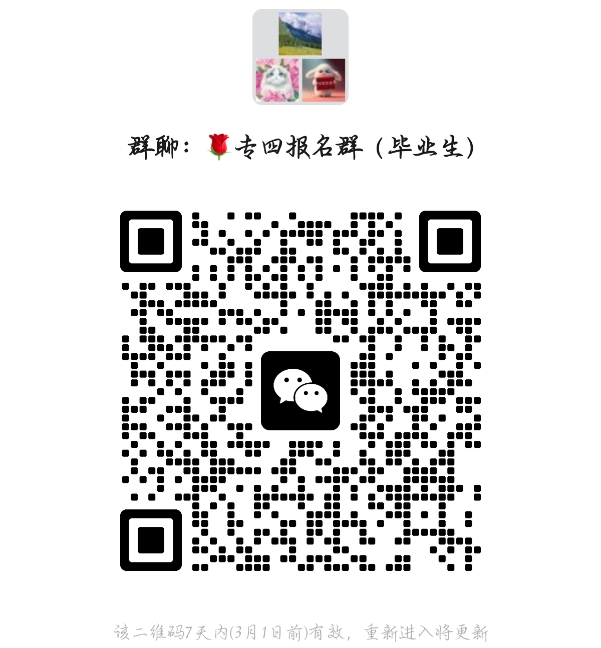 请2021年12月已经报名专四并申请延考的2018级毕业生扫描下方微信群二维码,进群后按照附件中本人对应的专四编号修改群昵称。2月28日24点前打开专四微信群接龙小程序,确认考试状态:①返校参加考试;②延考至2024年;③申请退费不再参加。