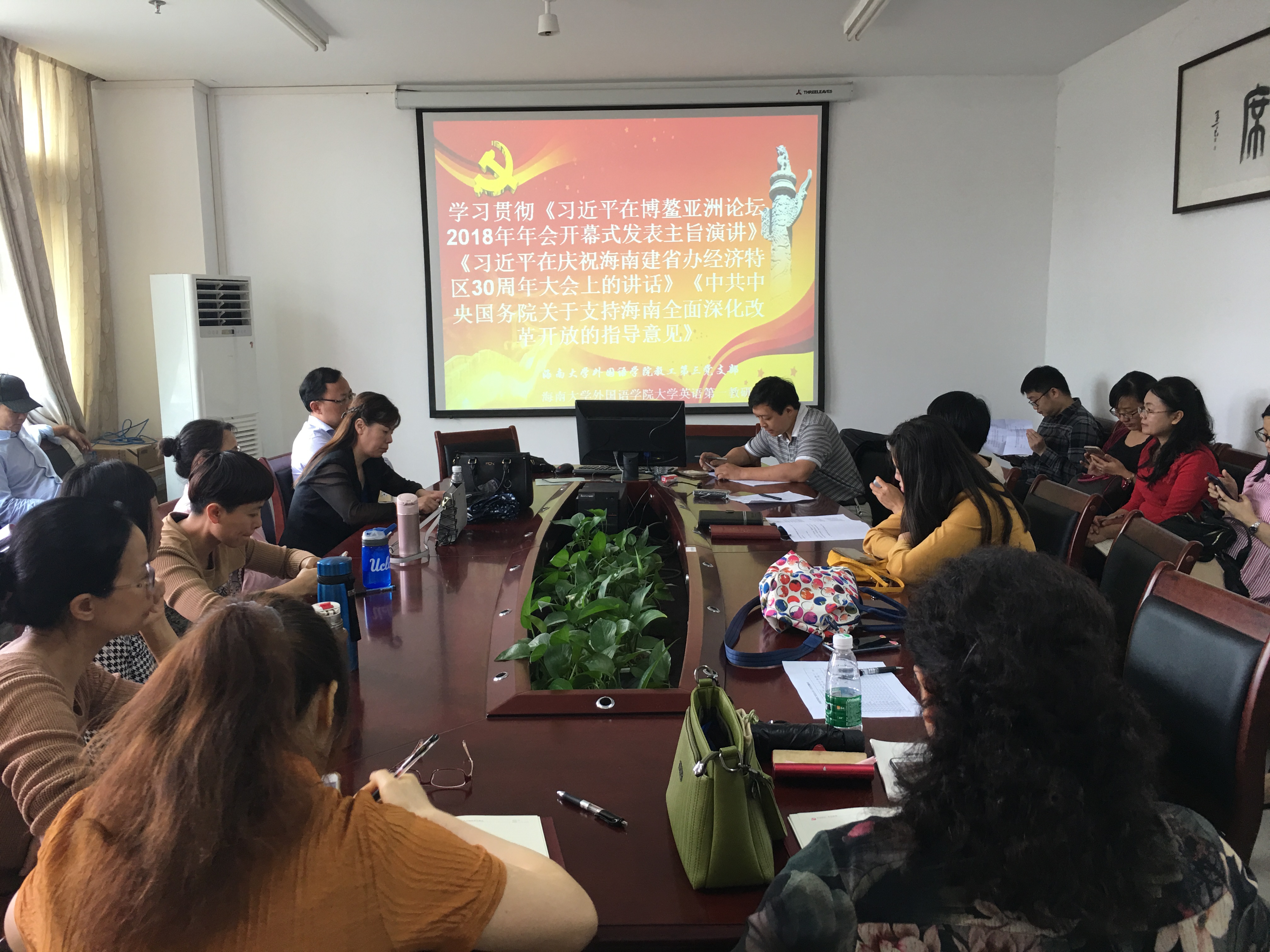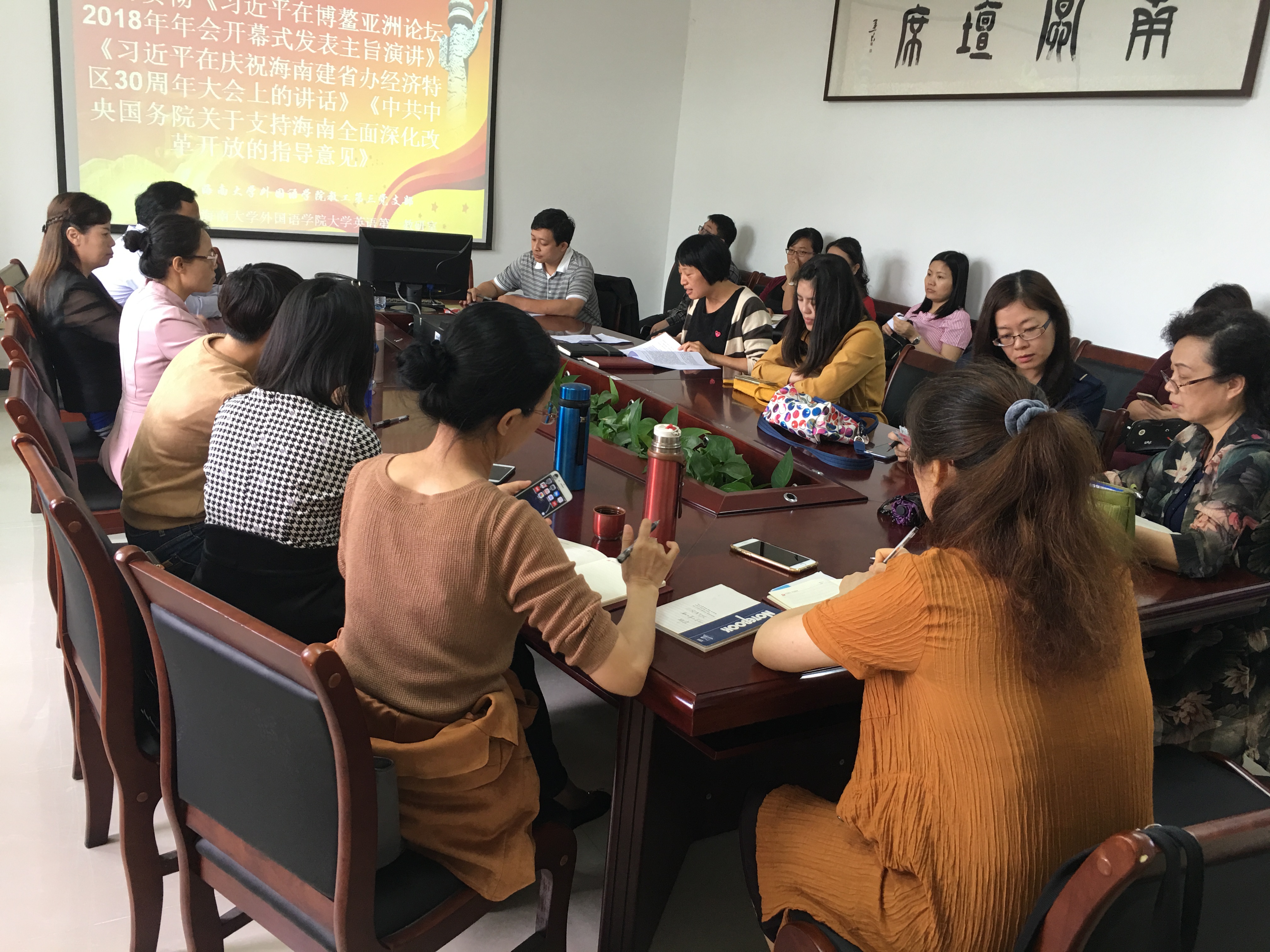 2018年4月17日下午3:30,威廉体育williamhill教工第三党支部在社科楼C312会议室召开支部大会,组织全体党员和老师们一起集中学习了《习近平在博鳌亚洲论坛2018年年会开幕式发表主旨演讲》、《习近平在庆祝海南建省办经济特区30周年大会上的讲话》和《中共中央国务院关于支持海南全面深化改革开放的指导意见》等重要讲话和文件精神。教工第三党支部全体党员和大学英语第一教研室的全体老师参加了会议。会议由支部书记史康和教研室主任张辉主持。