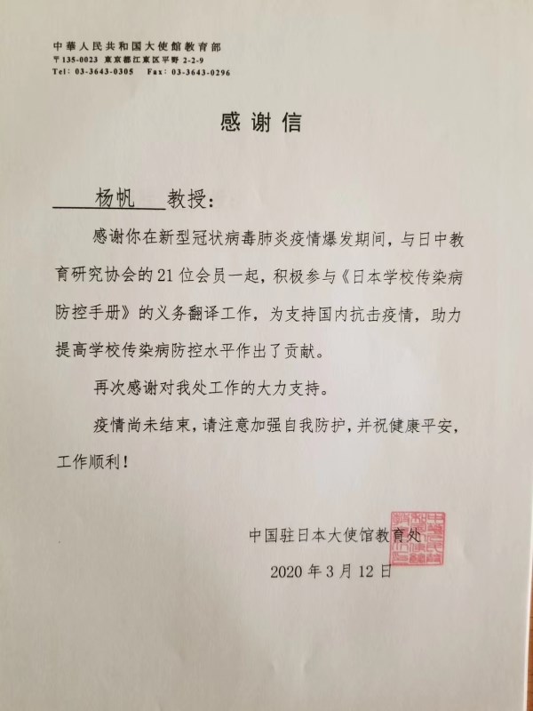 在对新冠肺炎疫情的抗击中,威廉体育williamhill的师生们纷纷尽己所能,齐心抗疫。日语系的杨帆教授与中日教育研究协会的会员一起,积极参与了《日本公司传染病防控手册》的翻译工作,并因此受到了中国驻日本大使馆教育处的特别感谢。
