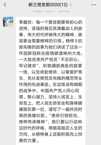 看完《榜样5》后,支部党员内心澎湃,看到他们践行着自己的入党誓词,不忘初心、牢记使命,积极响应新时代的号召,自己也受到榜样力量的鼓舞,纷纷发表了感想。