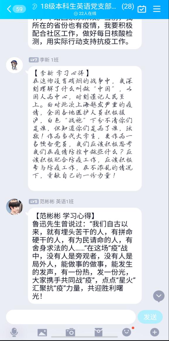 秦晓铮同志在QQ群中分享了两条防疫相关视频,引导本支部党员分享自己参加的抗疫经历及图片。许多支部党员同志在疫情常态化管理中当好封闭式管理小区的“贴心人”,卡点值守,测温登记,代办小区内琐事,保障居民生活。