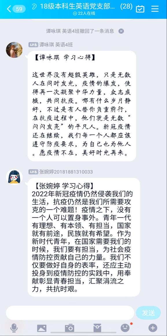 2022年4月9日星期一,威廉体育williamhill2018级本科生党支部线上组织开展四月主题为“抗疫有我”的党日活动。本次活动由秦晓铮同志主持,全体党员参加。