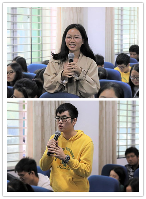 在问答环节中,同学们积极提问,肖发宣员工在如何兼顾学习和工作的问题上提出要利用好在公司的时间,努力学习的同时也要劳逸结合;符伟洋员工就自己的创业经历强调了人生积淀的重要性;吴世延员工则指出创业不要操之过急,要抓住社会主流、顺势而为。